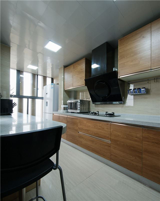厨房的橱柜是木质的,白色的大理石操作台在这里显得更加的干净,这边还设计了吧台,使用起来会更加的方便。