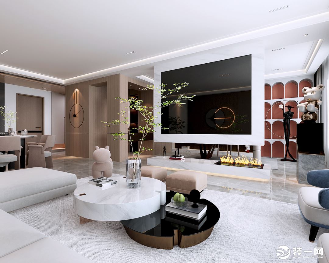 横梁处在客厅中间位置的,可以利用横梁设计悬空式电视背景墙,提升空间的颜值。