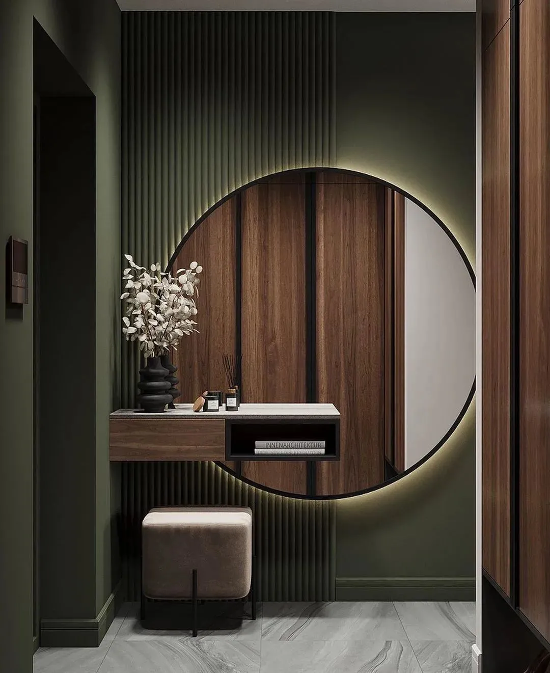 镜子不仅能帮助我们整理仪容仪表,也有放大空间的作用,换鞋凳与小型收纳柜满足日常玄关的基本需求。