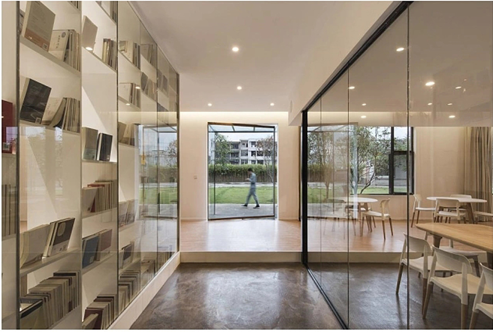 旧砖、木纹、水泥、黑铜在悠长的厂房内交相呼应,沿着白盒子一并融合在巨大的木结构屋顶下。局部夹层延伸着首层的功能形态,同时也打开了纵向的空间秩序。书吧区域的木质台阶配合可移动的展架,满足不同情境下自由组合。