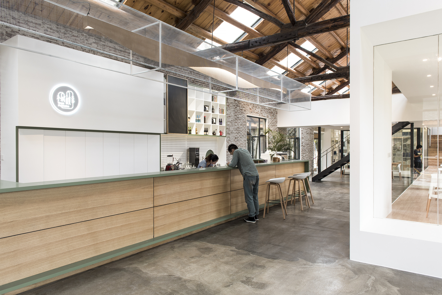人们进入厂区的第一个视觉焦点——A库的主门呈现为延伸的矩矩形洞口,引导游客进入其中。主空间在设计伊始,就决定在保留原有砖木结构肌理的前提下,将空间及功能进行有序的交错组织,而对于各个业态之间的联系及分隔,试图营造一种开放的通透感,人们在空间内能享受良好的采光。观看室外静谧的草木,来此旅居的游客与这座老厂房的故事就此展开。